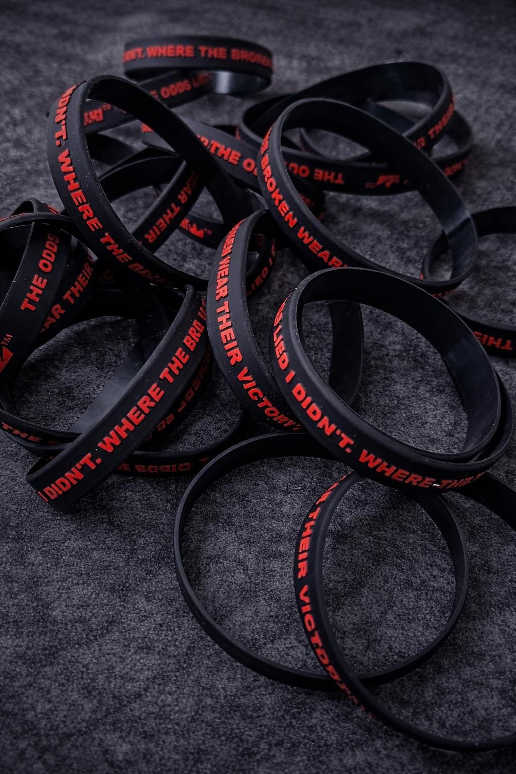 Made from durable black silicone and engraved in bold red lettering, it has the perfect mix of strength + inspiration, making it ideal for daily wear, gifting, or stacking with your favorite wristband.